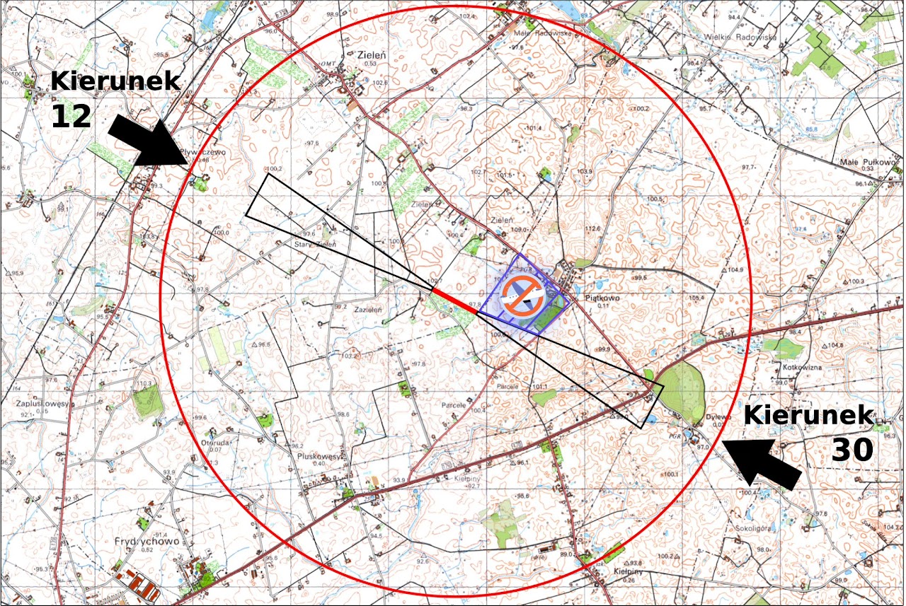Pas trawiasty, oznakowany. WDI 20m S od THR 12. Nr. ewid. ULC 506. UWAGA: Wykonywać wyłącznie krąg południowy. Na mapie oznaczono strefę zakazów lotów nad miejscowością Piątkowo. EN: Grass RWY, marked. WDI 20m S of THR 12. WARNING: Only Southern traffic pattern. The map shows a no-fly zone over Piątkowo.